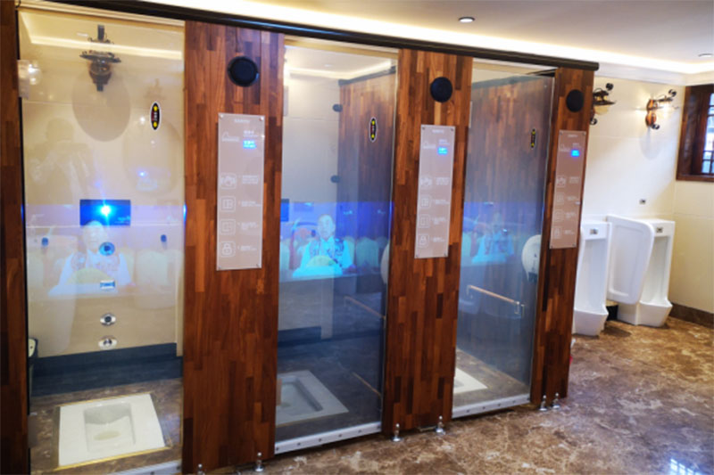 首先,讓人感觸最深的就是廁所的玻璃門,許多不了解的游客都看傻了眼,紛紛感嘆:要不要這么開放?透明的門怎么方便啊?其實,這是連接了感應控制系統的調光玻璃門。沒有人在里面的時候,玻璃門呈透明狀態,讓人一眼就能看到有空位;當有人進入廁所關上門后,玻璃門就會由透明瞬間轉換為不透明的霧化狀態,里面和外面都互相看不見,但玻璃的透光性良好,在里面的人不會感覺黑暗。