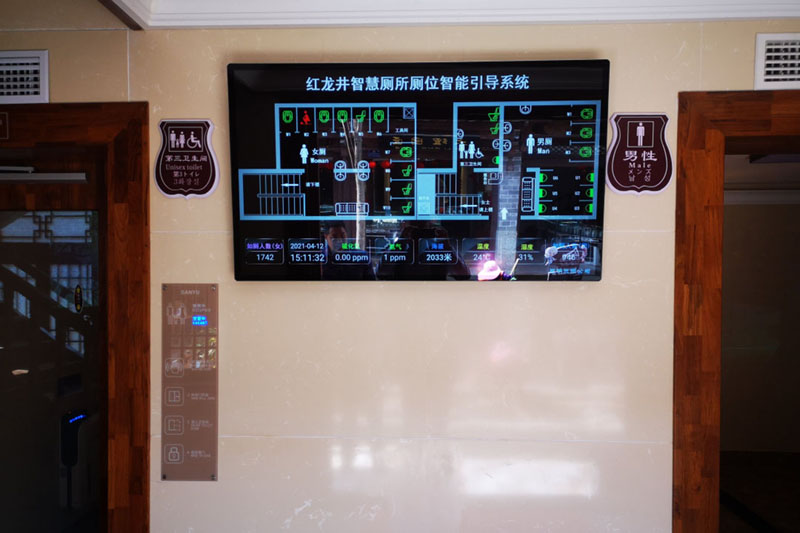 進入公廁之后,就能看到正前方的墻上掛著一個電子屏幕,可以查看廁所內的空間平面圖和各個廁所分布位置,還可以通過紅綠色的標志查看廁位是否正在被使用,有效避免廁所擁擠和排隊的情況。