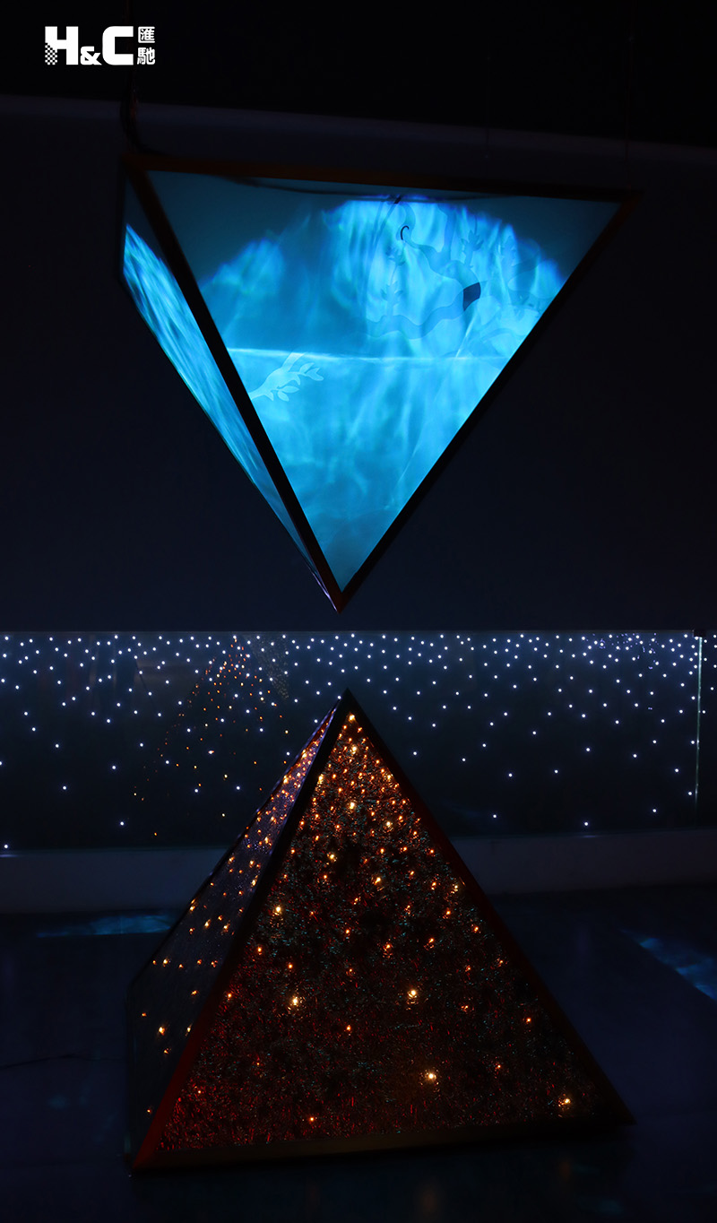 發(fā)光金字塔是用金碧莎玻璃、金茶鏡、LED燈珠以及特種紙等材料,經(jīng)過設(shè)計與藝術(shù)處理,再通過高溫夾膠制作而成的LED發(fā)光玻璃裝置。設(shè)計構(gòu)思獨特,效果炫麗新奇,滿足了人們對裝飾風(fēng)格多樣和美感的追求。