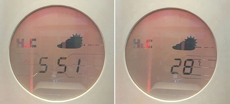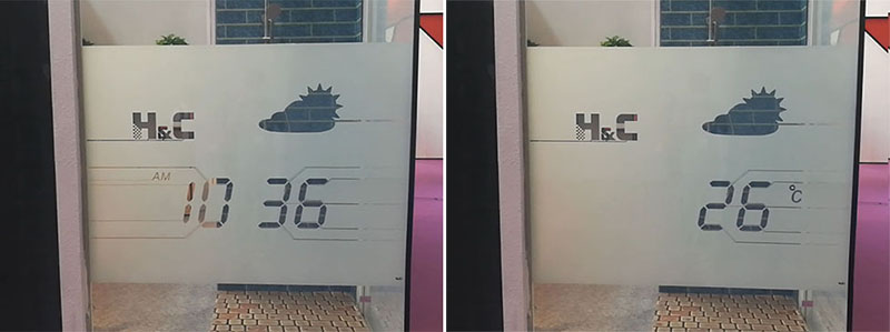 玻璃顯示的信息內容是不能更改的,比如視頻中的玻璃就只能顯示時間、天氣和溫度。它不同于LED顯示屏可以顯示任意信息,而是要預先設計好。比如公司的Logo、星期、月份、濕度等信息,都是可以在最初設計時加上去的。
