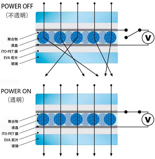 調光玻璃為“玻璃—膠片—液晶膜—膠片—玻璃”的五層夾膠結構,其中ITO-PET膜、聚合物、液晶合并為一層,稱為“液晶膜”層。