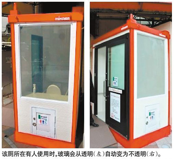 在日本大分市中心商業(yè)街街頭有一個(gè)應(yīng)用霧化玻璃的公廁(如下圖)。當(dāng)廁所里面沒(méi)人時(shí),從外面看一覽無(wú)余,有人進(jìn)入后,廁所里的傳感器就會(huì)感應(yīng),讓玻璃變霧化。